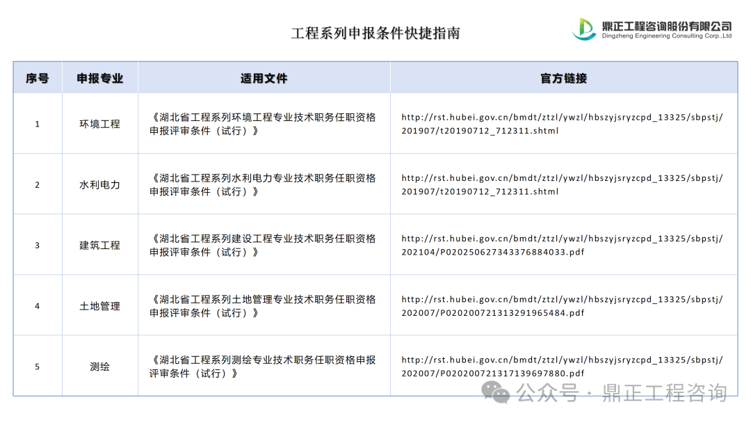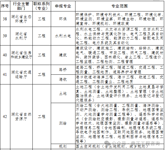 鄂職改辦已下發(fā)《湖北省職稱評審專業(yè)目錄》(鄂職改辦〔2021〕46號),其中工程系列已涵蓋環(huán)保、水利水電、建筑、土地、測繪、規(guī)劃等相關專業(yè),詳見下圖: